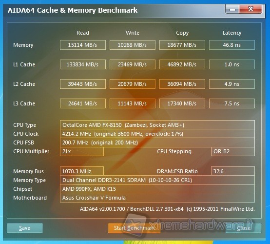 We noticed that this software does not currently provide completely correct results, as by performing the benchmark on the memories we have often noticed an L2 cache speed often less than the L3 cache in AMD FX-8150. Such behavior seems quite anomalous: though the L3 cache is exclusive type, is generally much slower than L2. Below we offer a screen that shows this situation, in the screen memories were set at a frequency of 2133 MHz: